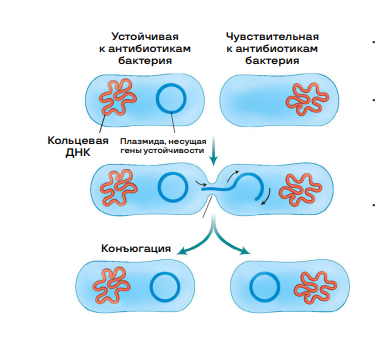 • Во время конъюгации происходит обмен генетической информацей между бактериями (передача плазмид через пили).