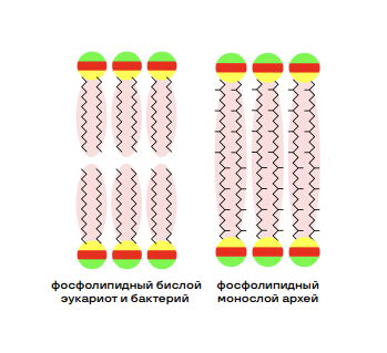 Выживать в экстремальных условиях археям позволяет особое строение мембраны – гидрофобные участки фосфолипидов «сшиваются», образуя единый фосфолипидный слой, который гораздо стабильнее обычного бислоя бактерий и эукариот