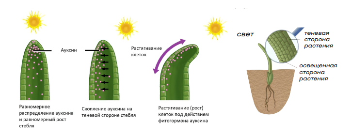 Ауксины образуются в конусе нарастания и в молодых листьях. Посредством диффузии они движутся вниз и накапливаются в клетках затенённой стороны стебля. Клеточные стенки закисляются, теряя свою жесткость и прочность, обеспечивая тем самым поступление внутрь воды и, как следствие, растяжение клеток (под воздействием внутриклеточного (тургорного) давления). Клетки теневой стороны растения становятся тяжелее и длиннее, что способствует наклону растения в сторону света.