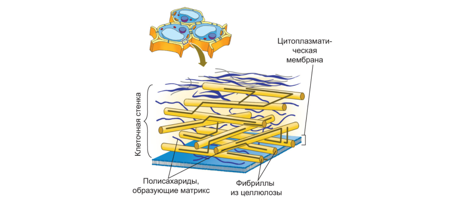 Клеточная стенка состоит из фибрилл (нитей) целлюлозы, погруженных в полужидкий матрикс из гемицеллюлозы и пектина.