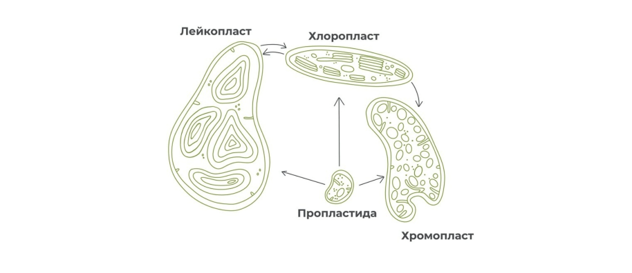 Имеют пластиды (хлоропласты, хромопласты и лейкопласты), способные к взаимопревращению друг в друга и образующиеся из мелких недифференцированных предшественников – пропластид.