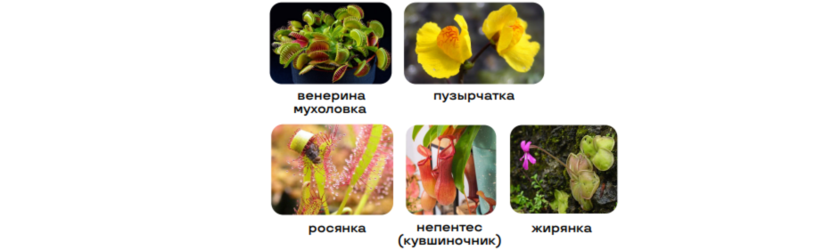 Примеры: венерина мухоловка, пузырчатка, росянка, непентес (кувшиночник), жирянка.