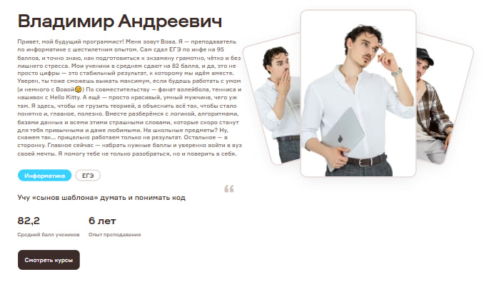 Мы рекомендуем Владимира Андреевича за системный подход к подготовке. Его методика дает результат, который подтверждается баллами учеников на экзамене.Для записи на занятия можно использовать платформу «ЕГЭ Хаб». Там представлены его курсы, информация о ценах и об оплате.