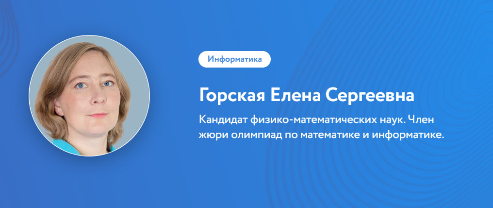 Горская Елена Сергеевна — кандидат физико-математических наук. Она окончила СУНЦ МГУ и механико-математический факультет МГУ. Ее специализация — алгоритмы и подготовка к олимпиадам.