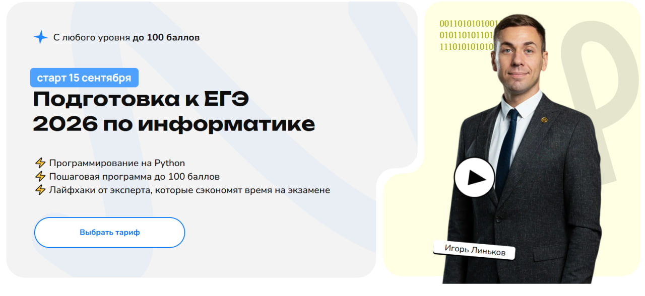 Владимир Андреевич (ЕГЭ HUB) | 6 лет. Личный результат: 95 баллов | 82+ | Упор на логику, алгоритмы и базы данных. После каждого урока — проверочная работа. Все занятия можно пересмотреть. | Требует соблюдения графика | 3 500 ₽/мес |