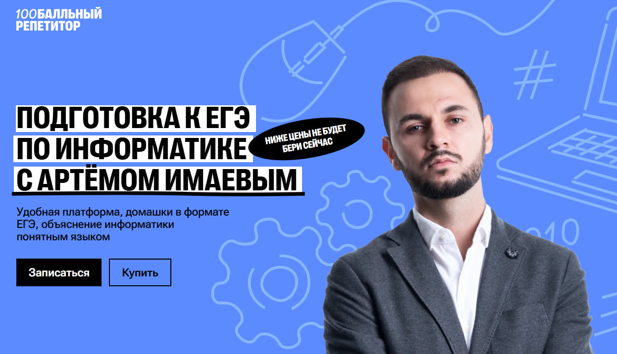 Артём Имаев имеет более 15 лет опыта подготовки к ЕГЭ по информатике. Артём предлагает курсы «Флэш» для 11 класса и годовую программу, которая направлена на доведение задач до автоматизма и закрытие пробелов в знаниях.