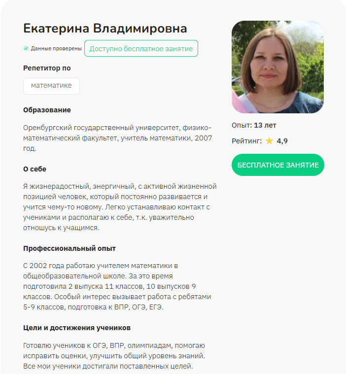 Екатерина Владимировна предлагает индивидуальную онлайн-подготовку в Тетрике. Она специализируется на подготовке к ЕГЭ по информатике, помогает ученикам развивать навыки программирования и анализа данных. Публичных метрик по результатам именно этого преподавателя в открытых источниках немного. При выборе рекомендуем запросить примеры работ и прогресс учеников за прошлый год. Это поможет вам принять правильное решение.