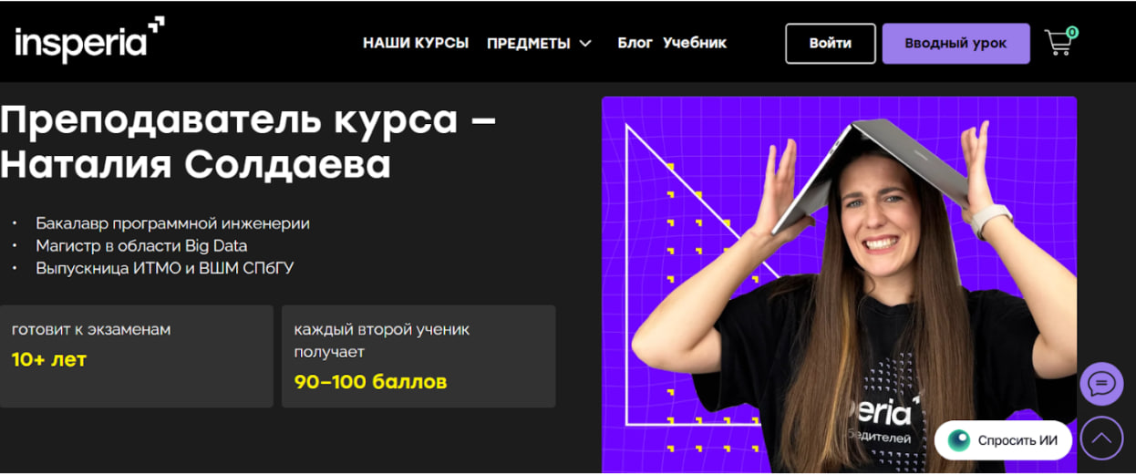 Наталия Солдаева (Insperia) | 10+ лет. ИТМО, ВШМ СПбГУ | 85+ | Программа выстроена от простого к сложному. Ошибки подробно разбираются. | Требует стабильности. Сложные задачи | 4 690 ₽/мес |