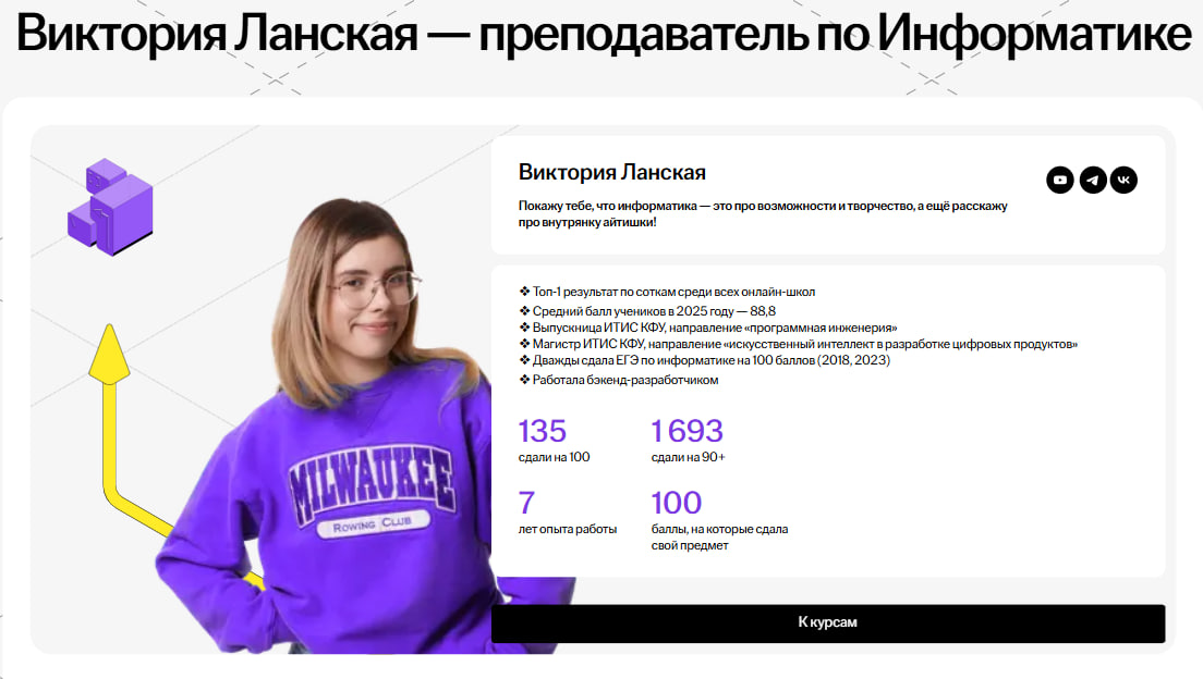 Виктория Ланская (Умскул) | 6 лет. Сдала экзамен в 11 классе на 100 баллов. Магистр ИТИС КФУ | 80+ | Показывает, как знания применяются в работе программиста и на основании них учит логике и решению задач. | Нехватка структуры. | 4 780 ₽/мес |