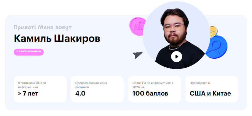 Камиль Шакиров (Сотка) | 7 лет. Сдал ЕГЭ-2024 на 100 баллов | 80+ | Учит действовать по схеме. Много тренировочных заданий, для отработки материала. | Жесткая программа. Мало форматов | 7 110 ₽/мес |
