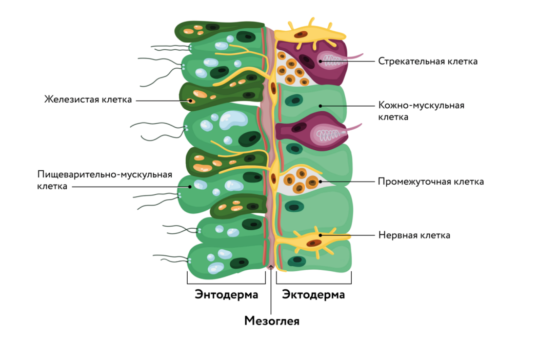 • Двухслойные животные (наружный слой - эктодерма, а внутренний - энтодерма), между которыми располагается межклеточное вещество – мезоглея;