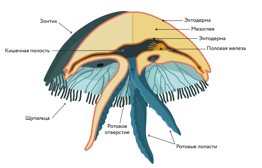 • Рот ведет в гастральную полость, от которой отходят радиальные каналы (гастральная система);