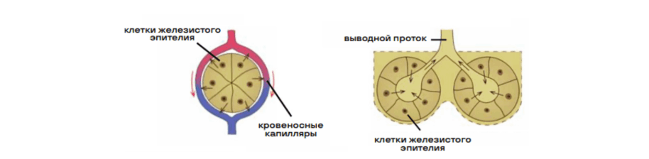 –образуют железы внутренней/эндокринной (не имеют выводных протоков, выделяют особые секреты – гормоны в кровь), внешней/экзокринной (имеют выводные протоки) и смешанной секреции.