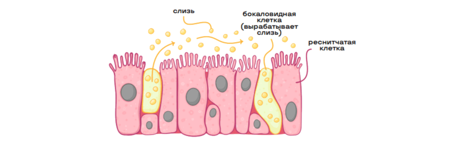 – реснички, в основе которых микротрубочки из белка тубулина – между реснитчатыми клетками расположены клетки, вырабатывающие слизь;