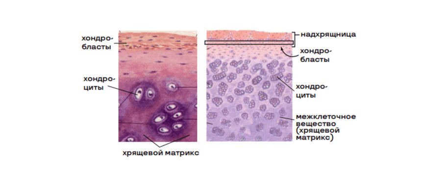 – клетки: молодые – хондробласты, расположены на поверхности (периферии), способны делиться, дают начало хондроцитам; зрелые – хондроциты , вырабатывают все компоненты хрящевого матрикса;