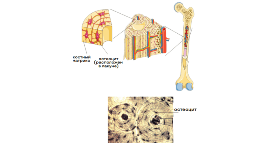 Остеоциты остеоцит (расположен в лакуне) костный матрикс: зрелые клетки, имеют тонкие многочисленные отростки, расположены в узких костных полостях – лакунах, образуют основную часть (90%) костной ткани.