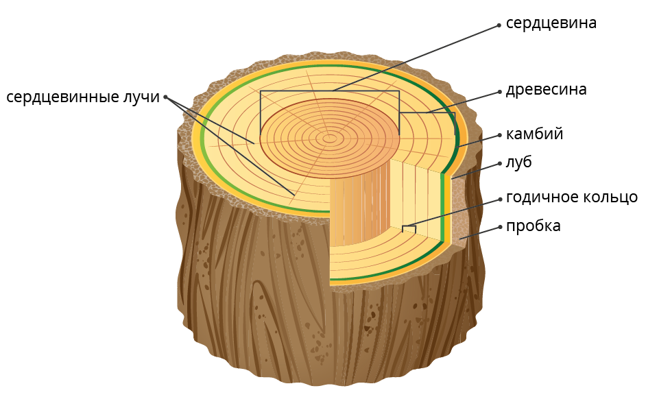 — Древесина (ксилема) - формирует годичные кольца древесных растений;