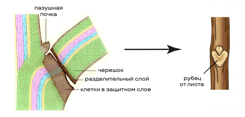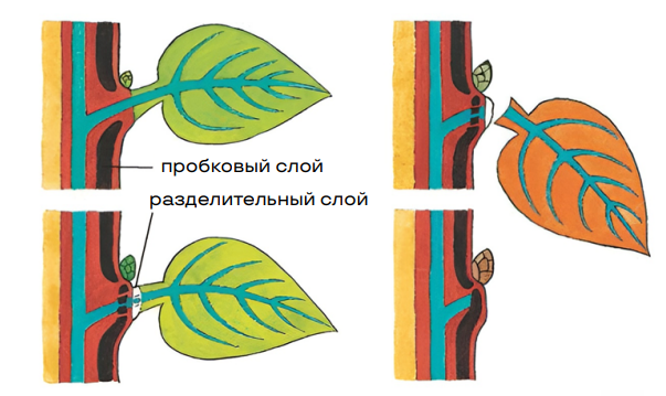 Происходит отток остатка органических веществ из листа. Начинается формирование слоя опробковевающих клеток в стебле. У основания листа формируется разделительный слой, который прекращает связь растения с листом. С порывом ветра лист опадает и на его месте формируется листовой рубец.