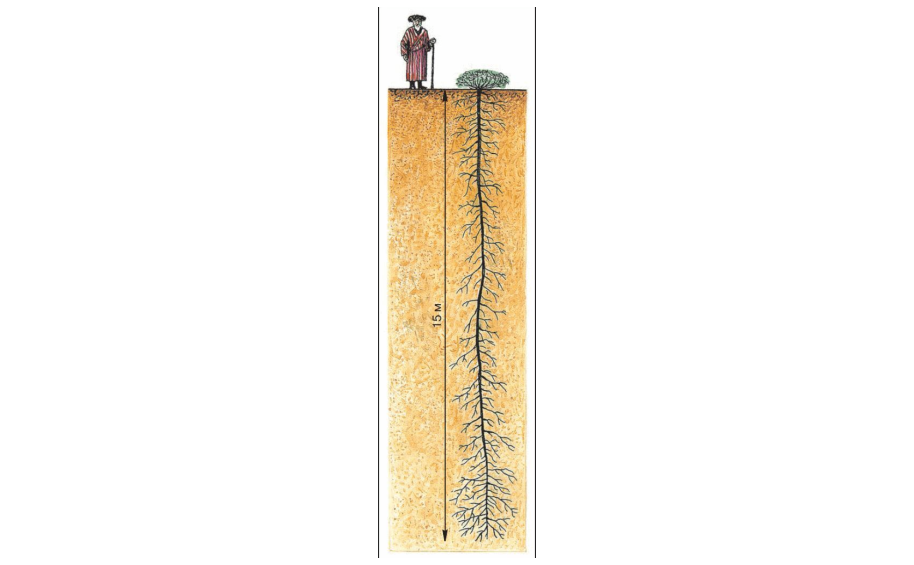 Характерна для растений, живущих в условии дефицита влаги (например, у верблюжьей колючки), корни уходят на глубину в несколько десятков метров (примерно 15-25), достигая грунтовых вод.