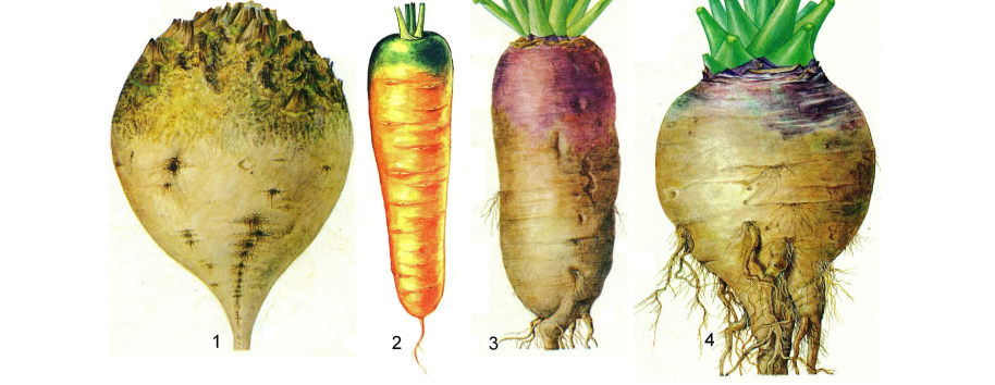 Примеры: морковь, свекла, редис, репа, турнепс (кормовая репа), брюква, редька, петрушка корневая, сельдерей корневой, пастернак.