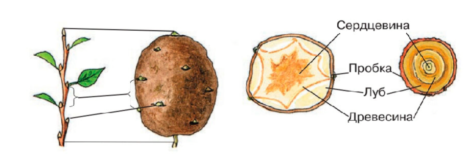 Побег состоит из стебля, листьев, узлов и почек. На клубне располагаются листовые рубцы – «бровки», в основании которых располагаются почки – «глазки». Среди почек различают верхушечные и пазушные. Имеются узлы и междоузлия на стебле побега. На поперечном срезе клубня различают пробку, кору, древесину и сердцевину, как и у побега.