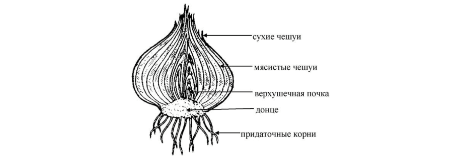 Побег состоит из стебля, листьев, узлов и почек. Имеет видоизмененный (уплощенный) стебель – донце, от которого отходят придаточные корн. На стебле расположены видоизмененные листья – сочные (запас питательных веществ) и сухие (защита от высыхания, механических повреждений, болезнетворных микроорганизмов) чешуи.