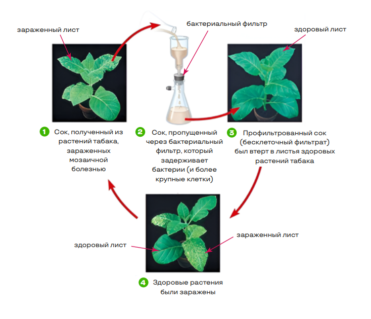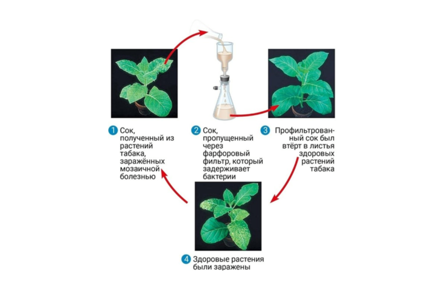 Полученная жидкость сохраняла способность вызывать заболевание даже после того, как была пропущена через специальный фильтр, задерживающий бактериальные клетки. Это послужило первым указанием на то, что существуют возбудители болезней, имеющие меньшие размеры, чем у бактерий.