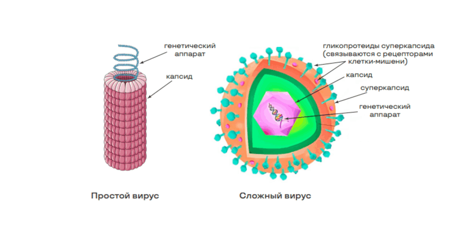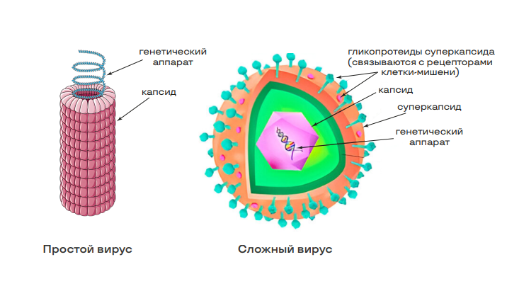 Вирусы не имеют клеточного строения: они состоят из нуклеиновой кислоты* и белковой оболочки (капсид), которая может состоять из одного или нескольких типов белковых молекул — капсомеров. Некоторые вирусы поверх капсида имеют также суперкапсид – оболочку из липидов, белков и гликопротеидов, которая самостоятельно вирусами не синтезируется, а является частью клетки-хозяина