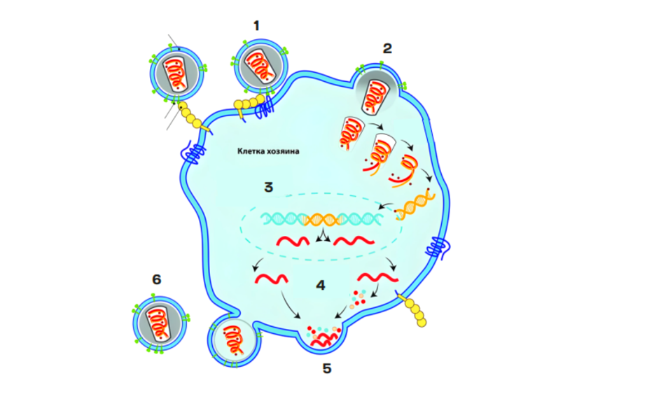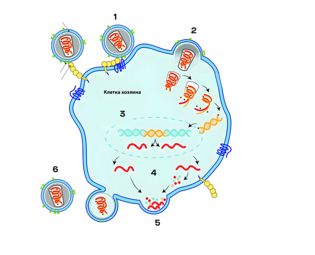 Прикрепление вируса к клеточной оболочке с помощью связывания с рецепторами на ее поверхности (адсорбция/фиксация вирионов на клетке). Проникновение (пенетрация/внедрение) вируса в клетку и его «раздевание» – утрата его белковой оболочки (депротеинизация) с высвобождением генетического материала (нуклеиновой кислоты). Встраивание нуклеиновой кислоты вируса в ДНК клетки-хозяина (с помощью фермента интегразы). Синтез новых вирусных компонентов – нуклеиновых кислот и белков. Сборка (формирование) новых вирусных частиц Выход новых вирусных частиц из клетки в окружающую среду.