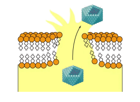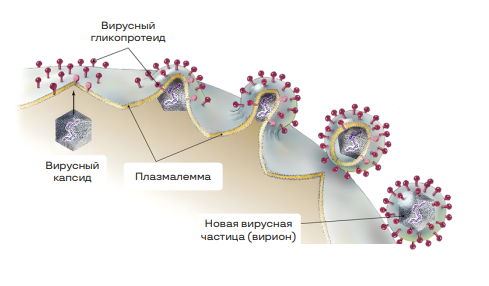 - путём «почкования» – через цитолемму клетки, забирая при этом ее части (характерно для сложных вирусов)
