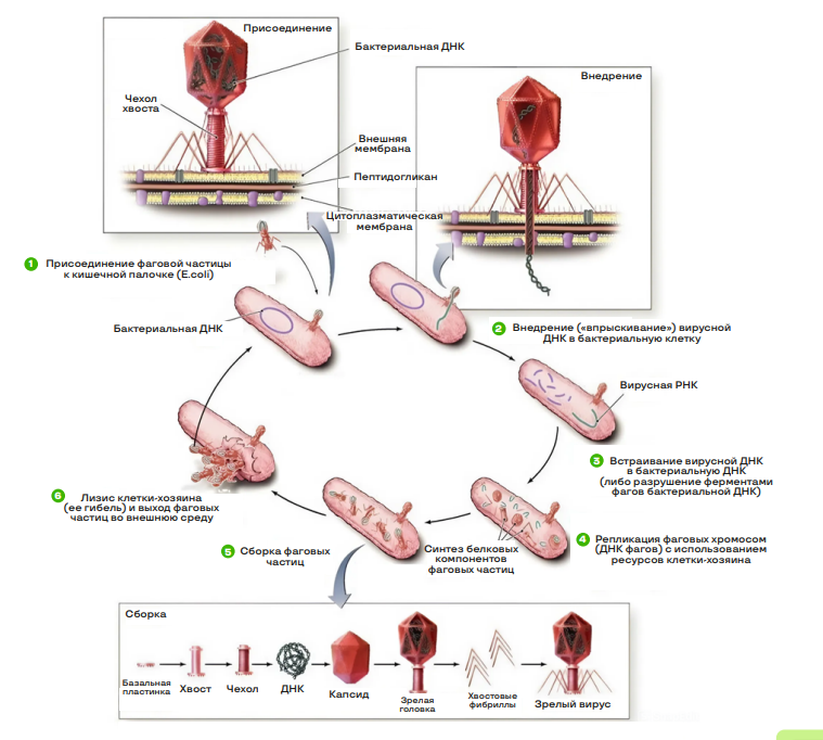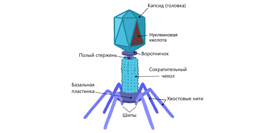 Хвост – состоит из полого стержня и сократительного чехла из белков. Обеспечивает проведение и впрыскивание наследственного материала в бактериальную клетку.