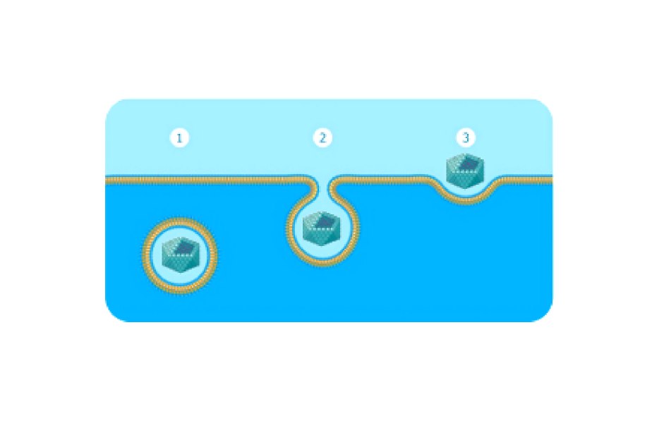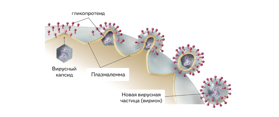 - путём «почкования» – через цитолемму клетки, забирая при этом ее части (характерно для сложных вирусов).